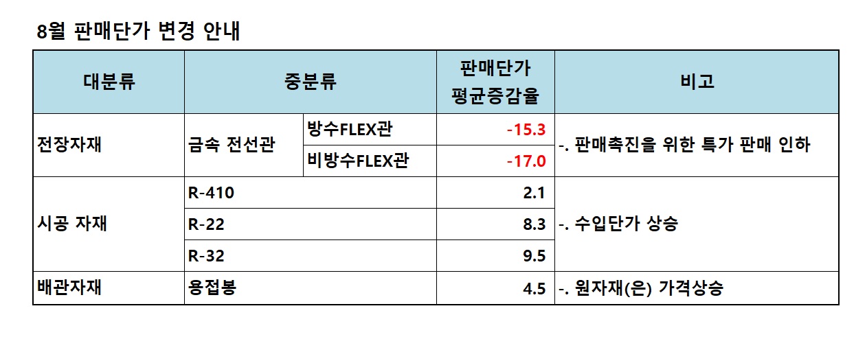 25년 8월 단가 변경 안내